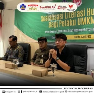 Kegiatan Sosialisasi Literasi Hukum bagi Pelaku Usaha Mikro, Kecil, dan Menengah (UMKM) dilaksanakan pada Kamis, 3 Juli 2025 di Gedung PLUT-KUMKM Kabupaten Klungkung, dengan tujuan untuk meningkatkan pemahaman pelaku UMKM terhadap berbagai aspek hukum yang relevan dalam pengembangan usaha, khususnya terkait dengan hak kekayaan intelektual.