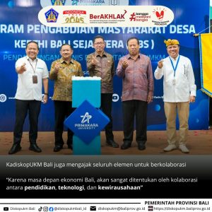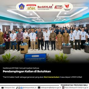 Kepala Dinas Koperasi dan UKM Provinsi Bali memberikan motivasi kepada ratusan mahasiswa yang akan berperan sebagai Pendamping Bisnis dan Digitalisasi bagi pelaku UMKM dalam Program Pengabdian Masyarakat Desa Kerthi Bali Sejahtera. Dalam kesempatan tersebut, KadisKopUKM Bali menegaskan bahwa kehadiran generasi muda sangat dibutuhkan untuk mendorong transformasi UMKM menuju usaha yang lebih inovatif dan adaptif terhadap perkembangan teknologi.
