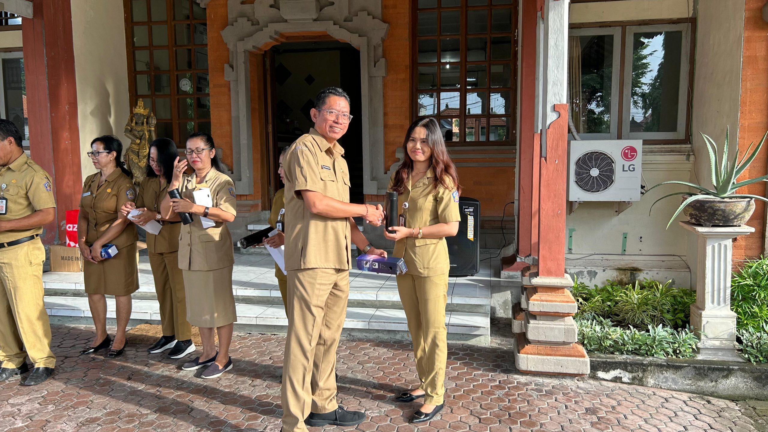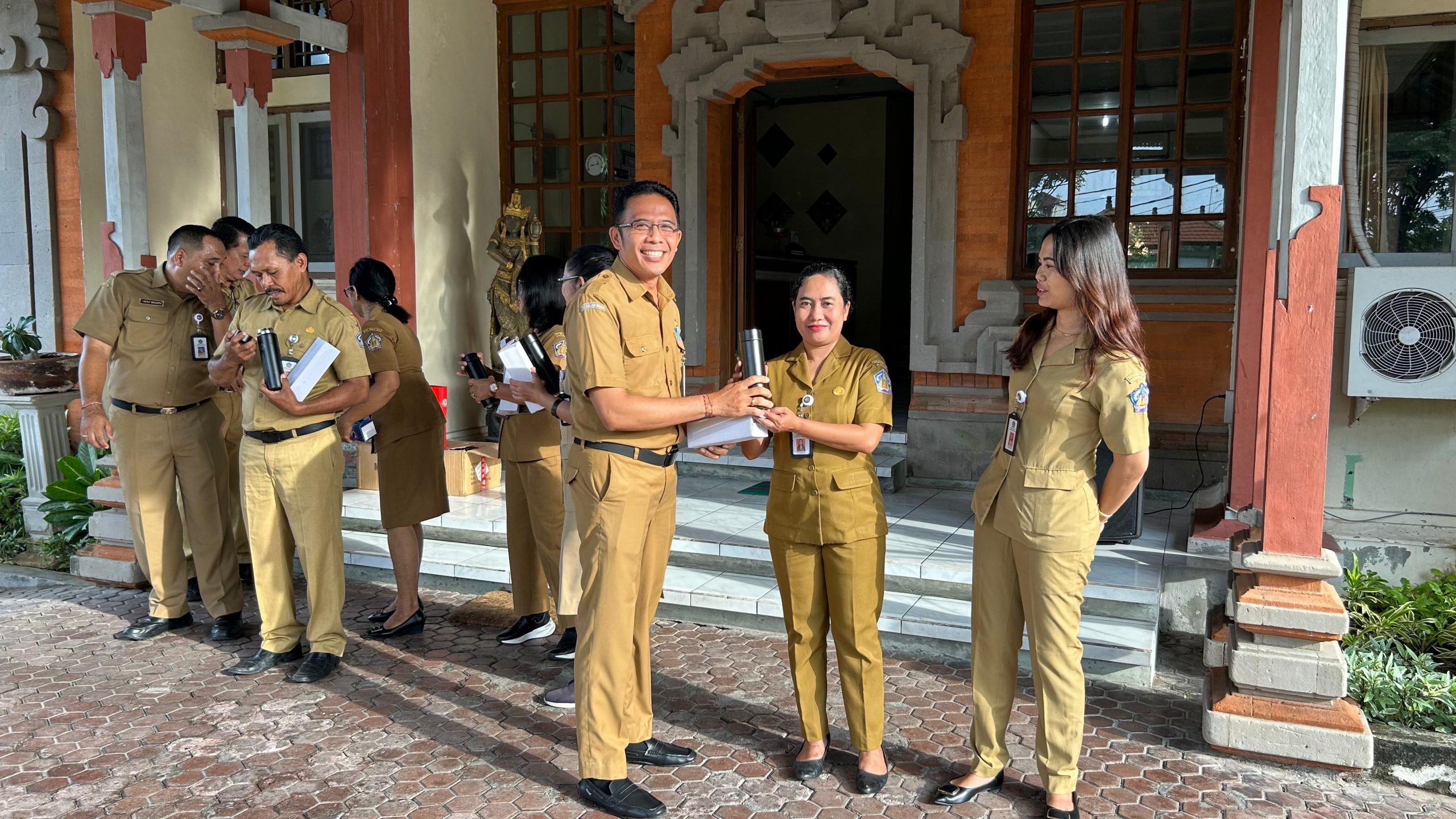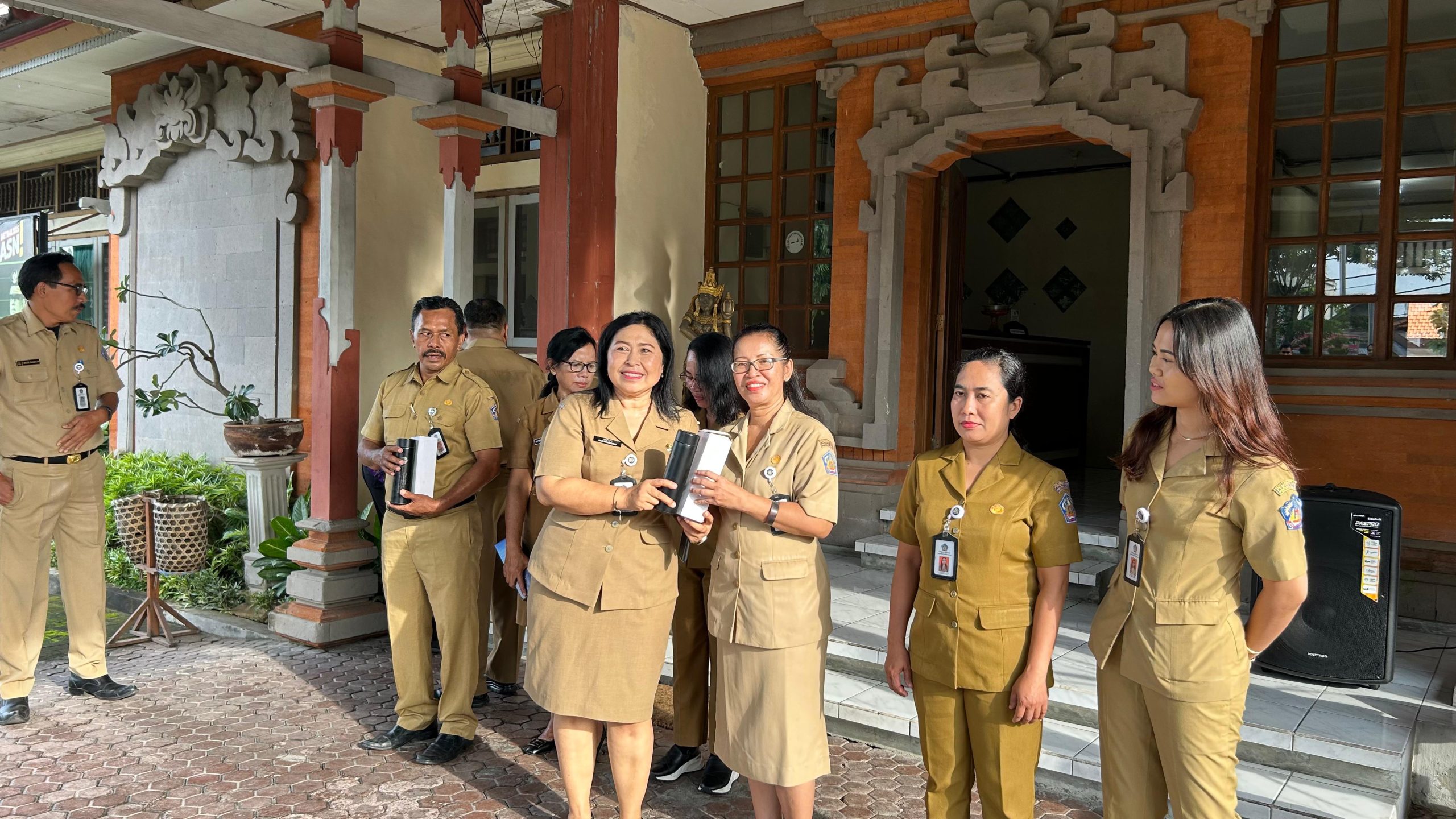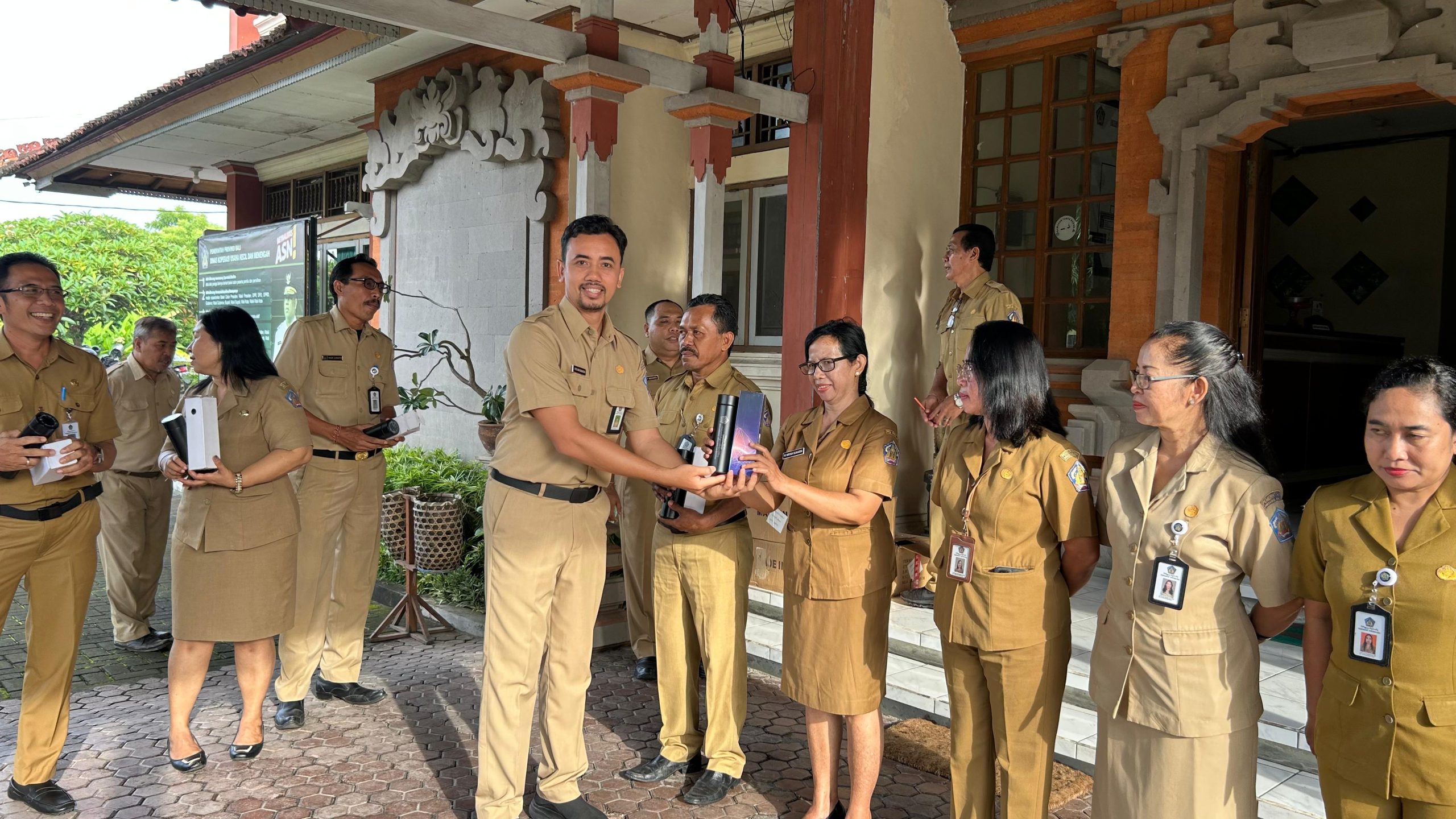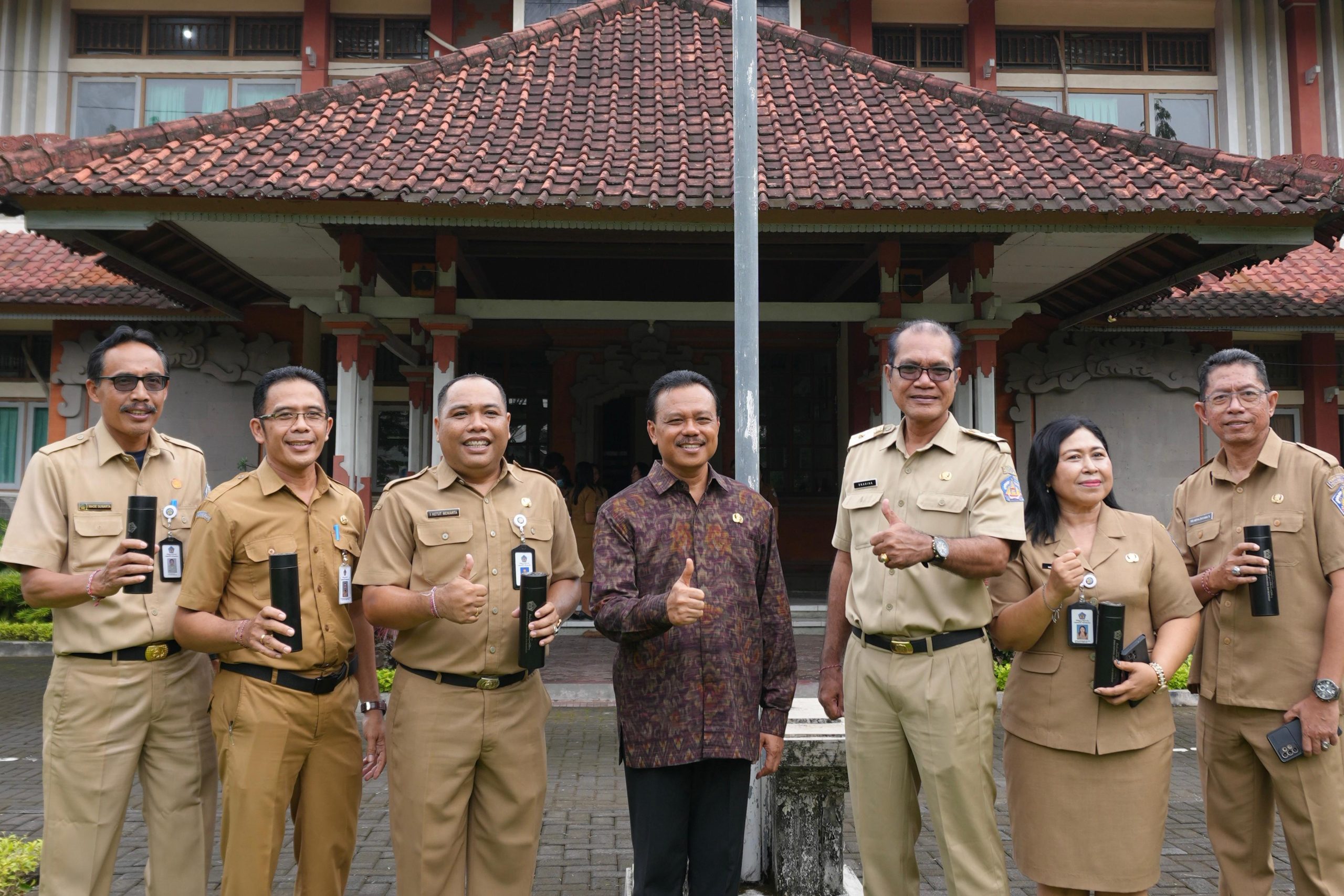 Selain meninjau penggunaan botol minuman plastik sekali pakai, Sekda Dewa Made Indra juga menyempatkan untuk berfoto bersama seluruh pegawai Dinas Koperasi dan UKM Provinsi Bali dengan memegang tumbler.